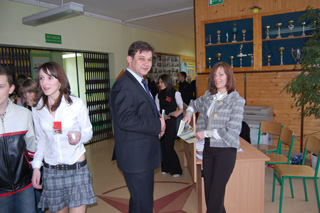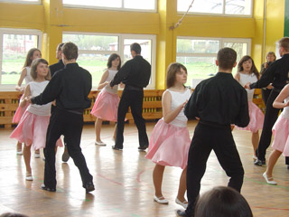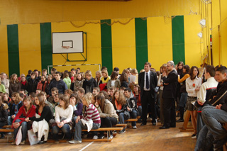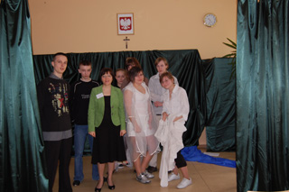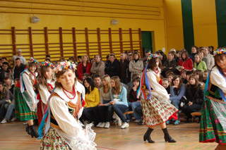 Gimnazjaliści i ich opiekunowie zostali powitani przez dyrektor szkoły Panią Iwonę Matysiak i starostę białobrzeskiego Pana Andrzeja Oziębło, a następnie obejrzeli występ odnoszącego sukcesy w kraju i za granicą Zespołu Tanecznego MISZ MASZ.