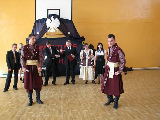 W dniu 29 kwietnia w naszej szkole odbyła się uroczysta akademia z okazji zbliżającej się rocznicy uchwalenia Konstytucji 3 Maja. Młodzież, przygotowana przez p. Katarzynę Rdzanek, przedstawiła montaż słowno-muzyczny, w którym przypomniała zarys dziejowy i uchwalenia tej pierwszej w Europie i drugiej na świecie ustawy regulującej prawa obywatelskie. Scenografię uroczystości przygotowali uczniowie pod kierunkiem p. Katarzyny Podpory. W akademii wzięli udział uczniowie klas I TH, II TH, II TE i III TE.