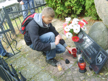 · Zwiedziliśmy cmentarz w Wyśmierzycach. Zapaliliśmy znicze przy grobie bohaterów poległych w obronie Ojczyzny. Na tym cmentarzu zobaczyliśmy również ciekawy żeliwny nagrobek.
