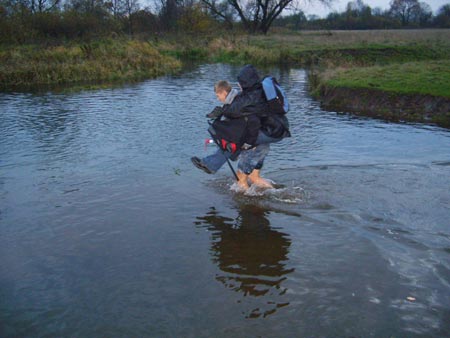 · Pokonywaliśmy wodne przeszkody, bo ktoś ukradł żelazną kładkę na Pierzchniance. Woda miała 5oC, a my przeszliśmy rzeczkę w bród. Chłopcy przenosili dziewczyny – trzem się udało, a jedna chlupnęła. Pani profesor nie zaryzykowała i sama przeszła. Szkoda!!!