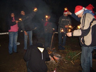 Podczas rajdu uczestnicy rozdali sobie prezenty mikołajkowe. Mimo małej mżawki było ognisko, kiełbaski i ziemniaczki pieczone. Atrakcją rajdu był kulawy pies, który przywędrował z nami z Jasionnej do Białobrzegów. Biedny, bezdomny piesek!!!!!