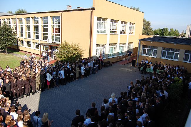 W dniu 1 września odbyła się uroczysta inauguracja roku szkolnego 2011/2012. Pani Dyrektor Iwona Matysiak serdecznie powitała pierwszego dyrektora naszej szkoły pana Edmunda Szafrańca, sekretarza Powiatu pana Piotra Kacprzaka, zastępcę Komendanta Państwowej Straży Pożarnej pana Zenona Jachowskiego oraz wszystkich pracowników szkoły, rodziców i uczniów. Następnie przypomniała o kolejnej rocznicy wybuchu II wojny światowej. Obecni na uroczystości uczcili minutą ciszy wszystkich, którzy wtedy polegli. Pani Dyrektor serdecznie przywitała uczniów klas pierwszych, którzy rozpoczynają naukę w naszej szkole, a także nowozatrudnionych nauczycieli: p. Renatę Grzmiel, p. Annę Haba, p. Małgorzatę Bek, p. Piotra Motykę, p. Krzysztofa Harwackiego. W dalszej części uroczystości miało miejsce odebranie przysięgi od nauczycieli, którzy uzyskali pozytywną ocenę swojego dorobku zawodowego: od p. Joanny Kacprzak, p. Małgorzaty Nowak, p. Piotra Cichawy, p. Joanny Piekarskiej i p. Piotra Bańkowskiego. Sekretarz Powiatu pan Piotr Kacprzak po odebraniu przysięgi wręczył nauczycielom akty nadania stopnia nauczyciela mianowanego. Na koniec pani Dyrektor życzyła całej Społeczności Szkolnej dużo optymizmu, jak największego zapału do pracy, a rodzicom jak najwięcej satysfakcji z osiąganych przez ich dzieci sukcesów.
