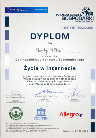 Z wielką radością odebraliśmy wiadomość we wtorek 15 kwietnia 2008r., że uczennica Ewelina Wlazło została laureatką konkursu, gdyż otrzymała wyróżnienie I stopnia. Spośród 104 prac konkursowych praca Eweliny została uznana za jedną z najlepszych w kategorii prezentacja multimedialna. Prace oceniane były przez Jury złożone ze specjalistów reprezentujących różne dziedziny nauki i sztuki. Jury konkursu przyznało jedną nagrodę główną oraz wyróżnienia I i II stopnia. Wśród trzech uczestników konkursu, którzy otrzymali wyróżnienie I stopnia znalazła się na drugim miejscu Ewelina Wlazło. Wyniki zostały ogłoszone na stronie Konkursu pod adresem: www.zyciewinternecie.wsg.byd.pl