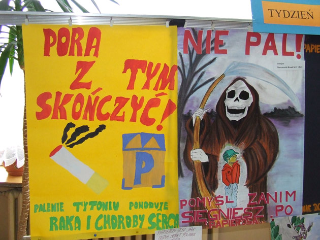W dniach 5 – 12 listopada 2007 roku w naszej szkole obchodzony jest „Tydzień bez papierosa” w celu uświadomienia wszystkim palaczom, jak wielkimi szkodnikami są papierosy. Według WHO tytoń jest jedną z głównych przyczyn zgonów, a nikotynizm jest jedną z najpoważniejszych chorób współczesnego świata. Ideą tej akcji jest zwrócenie uwagi nie tylko na szkodliwość palenia tytoniu, ale także zaapelowanie do palaczy o podjęcie decyzji woli, mających na celu wyzwolenie się z tego straszliwego uzależnienia. Uczniowie naszej szkoły pod kierunkiem pani Jolanty Babik i Elżbiety Michalak, wzięli udział w szkolnym konkursie plastycznym na temat „Szkodliwości palenia tytoniu”.