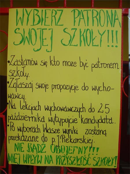 Od początku roku szkolnego w Zespole Szkół Ponadgimnazjalnych trwa akcja wyboru patrona szkoły. Projekt pod nazwą "Nadanie imienia szkole" realizuje cała społeczność szkoły - uczniowie, rodzice i nauczyciele.
