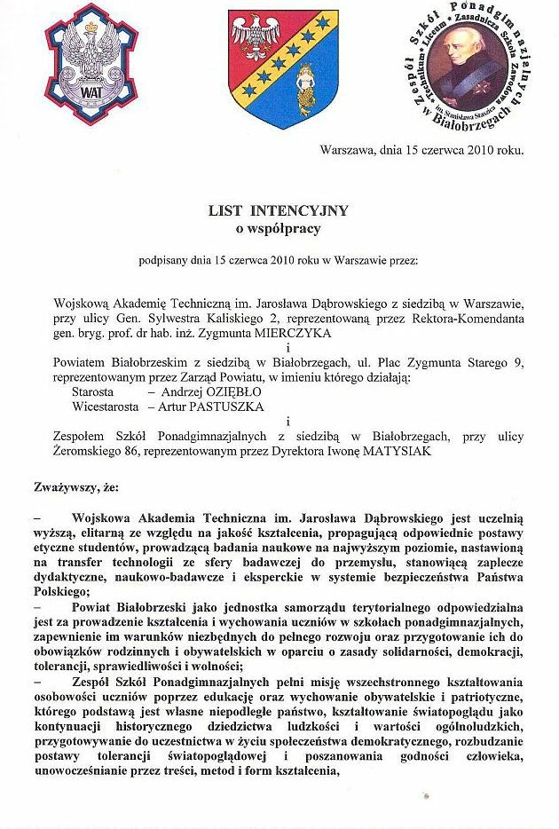 W dniu 15 czerwca 2010 roku został podpisany list intencyjny o współpracy Wojskowej Akademii Technicznej im. Jarosława Dąbrowskiego reprezentowaną przez Rektora – Komendanta gen. bryg. prof. dr hab. inż. Zygmunta MIERCZYKA, Powiatu Białobrzeskiego reprezentowanego przez Starostę Andrzeja OZIĘBŁO i Wicestarostę – Artura PASTUSZKA i Zespołu Szkół Ponadgimnazjalnych w Białobrzegach reprezentowanym przez Dyrektor Iwonę MATYSIAK. Podpisanie porozumienia obserwowali dyrektor Sekretariatu Ministra Obrony Narodowej gen. bryg. Artur Kołosowski, Zastępca Kanclerza Pełnomocnik Rektora ds. Rozwoju Dariusz Pomaski, przedstawiciel 1. Ośrodka Radioelektronicznego – ppłk Adam OCIECZEK, Skarbnik Powiatu Białobrzeskiego Barbara ŚWIERCZ i Wicedyrektor Zespołu Szkół Ponadgimnazjalnych Piotr KACPRZAK.