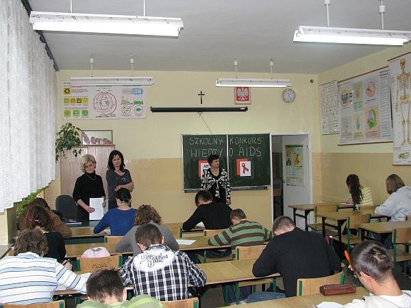 W związku z tym 1 grudnia w naszej szkole odbył się Szkolny Konkurs Wiedzy o AIDS, mający na celu propagowanie wiedzy i uświadomienie młodzieży zagrożeń związanych z AIDS. W konkursie wzięli udział uczniowie technikum i liceum profilowanego. Uczestnicy rozwiązywali test składający się z 25 pytań. Nad prawidłowym przebiegiem konkursu czuwała komisja w składzie: p. Jolanta Babik, pielęgniarka szkolna p. Janina Kosobudzka oraz wychowawca świetlicy szkolnej p. Elżbieta Michalak.