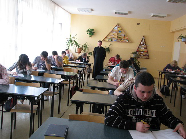 Eliminacje szkolne odbyły się 23 marca 2010r. W konkursie wzięło udział 36 uczniów z następujących klas: Kl III LPZI (15 uczestników ); Kl II TA (16 uczestników); Kl II LPEA 3 uczestniczki); Kl. I E (2 uczestników). Odpowiedzialnym za przeprowadzenie konkursu był Ks. Tomasz Kośla. Serdeczne podziękowania za pomoc w przeprowadzeniu tego konkursu dla pani Katarzyny Socha oraz pani Krystyny Kozłowskiej.