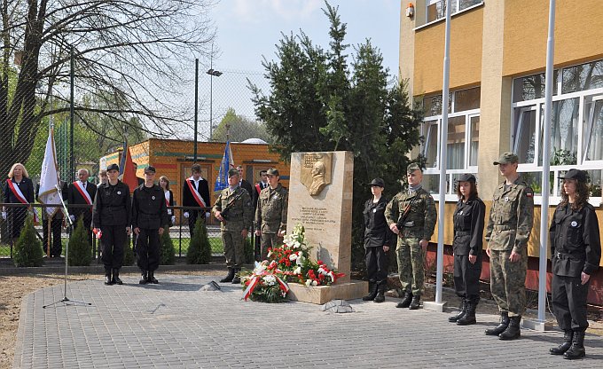 Po odegraniu hymnu przystąpiono do odsłonięcia przed budynkiem szkoły tablicy pamiątkowej poświęconej naszemu patronowi. Odsłonięcia tablicy dokonali – p. Iwona Matysiak – dyrektor szkoły, p. Andrzej Oziębło – starosta powiatu białobrzeskiego i Mateusz Oleksak – przewodniczący Samorządu Uczniowskiego. Po poświęceniu tablicy przez ks. Artura Hejdę i ks. Tomasza Koślę, uczniowie i inne delegacje złożyli kwiaty.