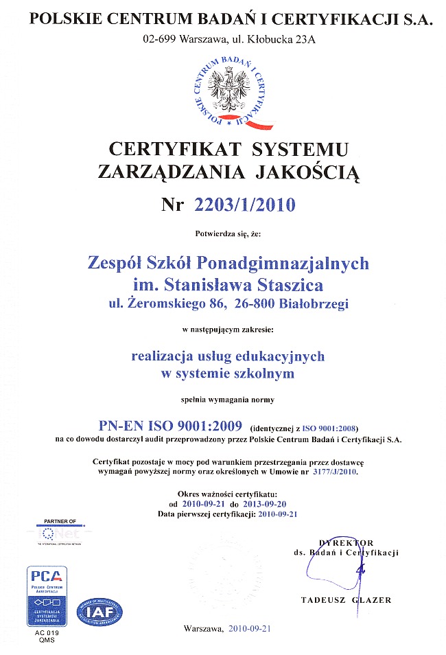 Nasza Szkoła – Zespół Szkół Ponadgimnazjalnych im. Stanisława Staszica w Białobrzegach, otrzymała w dniu 13 października 2010 roku Certyfikat Jakości nadany przez Polskie Centrum Badań i Certyfikacji w Warszawie potwierdzający wdrożenie System Zarządzania Jakością oparty na normie PN-EN ISO 9001:2009. Certyfikat obejmuje działalność Zespołu Szkół Ponadgimnazjalnych w zakresie realizacji usług edukacyjnych w systemie szkolnym tj. diagnozy, planowania, projektowania, realizacji, nadzoru i efektów w dziedzinie dydaktyki, wychowania oraz opieki na poziomie ponadgimnazjalnym.