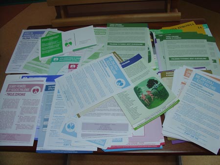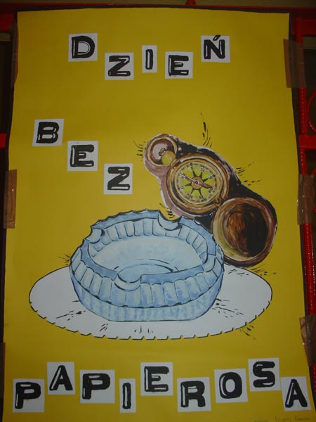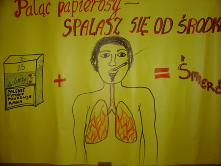 W holu głównym szkoły zorganizowana została wystawa prac konkursowych – wierszy i plakatów oraz udostępniono ulotki edukacyjne o szkodliwości palenia tytoniu, z którymi można się zapoznać celem uświadomienia sobie szkodliwego wpływu papierosów na organizm człowieka.