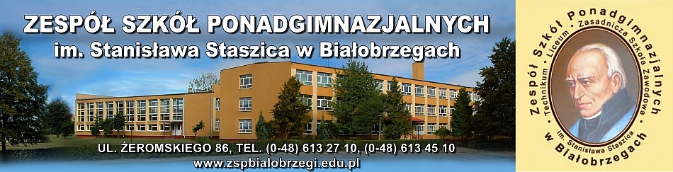 Zespół Szkół Ponadgimnazjalnych w Białobrzegach 26-800 Białobrzegi ul. Żeromskiego 86 tel. 048 613 27 10, fax. 048 613 45 10, e-mail: zspbialobrzegi@poczta.onet.pl Copyright © 2007 Zespół Szkół Ponadgimnazjalnych im. Stanisława Staszica w Białobrzegach. Wszystkie prawa zastrzeżone.