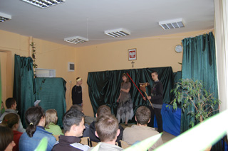 Gimnazjaliści i ich opiekunowie zostali powitani przez dyrektor szkoły Panią Iwonę Matysiak i starostę białobrzeskiego Pana Andrzeja Oziębło, a następnie obejrzeli występ odnoszącego sukcesy w kraju i za granicą Zespołu Tanecznego MISZ MASZ.