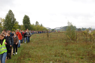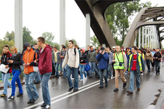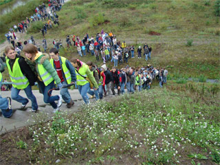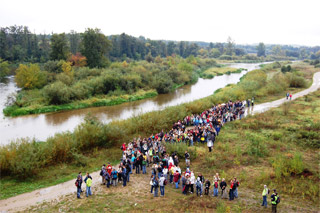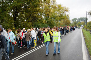 Trasa rajdu była urozmaicona. Po odprawie na boisku szkolnym wyruszyliśmy ulicą Krakowską pod Starostwo Powiatowe, gdzie do nas dołączyły klasy z LO. Dzięki pomocy Policji bezpiecznie przeszliśmy stary most na Pilicy (piękny!) a następnie dotarliśmy do nowego mostu. Było nas dużo! Około 350 osób! Gdy jedni schodzili już z mostu to inni dopiero na niego wchodzili. Na łące odbyły się konkursy. Następnie przez lasy i pola dotarliśmy do naszej Szkoły gdzie czekało już rozpalone ognisko. Na zakończenie rajdu Pani v-ce Dyrektor Renata Korczak i opiekunka Szkolnego Koła Krajoznawczo-Turystycznego pani Wioletta Ziemnicka wręczyły zwycięzcom konkursów dyplomy i nagrody ufundowane przez Radę Rodziców.