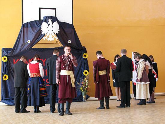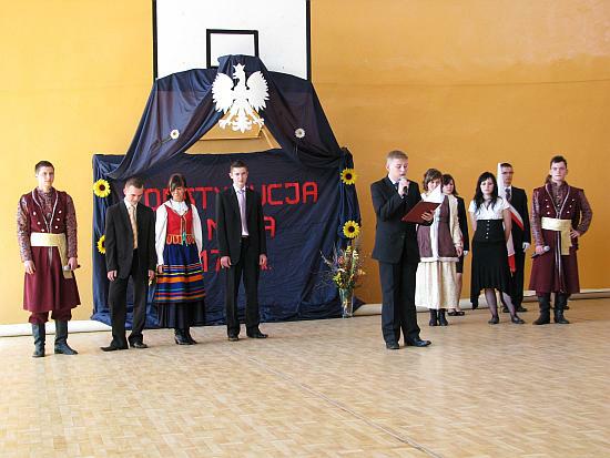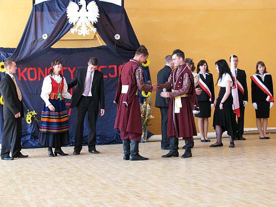 W dniu 29 kwietnia w naszej szkole odbyła się uroczysta akademia z okazji zbliżającej się rocznicy uchwalenia Konstytucji 3 Maja. Młodzież, przygotowana przez p. Katarzynę Rdzanek, przedstawiła montaż słowno-muzyczny, w którym przypomniała zarys dziejowy i uchwalenia tej pierwszej w Europie i drugiej na świecie ustawy regulującej prawa obywatelskie. Scenografię uroczystości przygotowali uczniowie pod kierunkiem p. Katarzyny Podpory. W akademii wzięli udział uczniowie klas I TH, II TH, II TE i III TE.