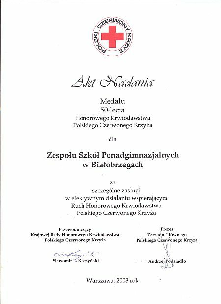 W dniu 2 grudnia br. pani dyrektor Iwona Matysiak wraz z opiekunką SK PCK Marleną Stolarczyk uczestniczyły w uroczystości 50-lecia PCK zorganizowanej przez Rejonowy Zarząd PCK w Białobrzegach. Na uroczystość, która odbyła się w Miejskim Domu Kultury przybyli również między innymi: Starosta białobrzeski Andrzej Oziębło, proboszcz parafii białobrzeskiej – ksiądz Artur Hejda. Pani dyrektor Iwona Matysiak odebrała, pamiątkowy medal PCK wydany dla naszej szkoły, za popieranie i propagowanie idei honorowego krwiodawstwa. SK PCK.