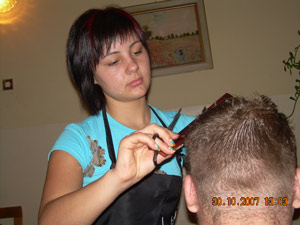 Angelika Stępień, Marta Imiołek, Żaneta Jędra (uczennice klasy I D) oraz Ilona Andrzejewska, Iwona Jasiorowska, Karol Tkaczyk, Artur Mrowiński (uczniowie klasy II D) z uśmiechem na twarzy, z wielkim zapałem strzygli i układali różne fryzury.