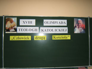 W dniu 7 stycznia 2008r. odbyła się XVIII Olimpiada Teologii Katolickiej - etap szkolny. Tematem przewodnim tegorocznej Olimpiady jest hasło "Człowiek drogą Kościoła". W olimpiadzie wzięło udział 42 uczniów, w tym 4 z klas zawodowych. Temat Olimpiady nawiązuje do słów Sługi Bożego Jana Pawła II, zawartych w jego pierwszej encyklice "Redemptor hominis" ("Odkupiciel człowieka"). "Człowiek (...) jest pierwszą i podstawową drogą Kościoła (...). Dlatego usprawiedliwiona jest troska Kościoła o to, aby życie ludzkie stawało się coraz bardziej ludzkie, aby wszystko, co na to życie się składa, odpowiadało prawdziwej godności człowieka... Sytuacja w świecie współczesnym daleka jest bowiem od wymagań porządku moralnego, sprawiedliwości i miłości społecznej - człowiek coraz bardziej bytuje w lęku" (NR.15). Stąd celem Olimpiady jest poznanie prawdy o człowieku stworzonym przez Boga, a odkupionym przez Jezusa Chrystusa; a także kształtowanie umiejętności rozpoznania i moralnej oceny współczesnych zagrożeń ludzkiej godności. Uczniowie przygotowujący się do testu zapoznawali się głównie z tekstami Karola Wojtyły - fragmentami Jego "Elementarza Etycznego", Encykliki "Redemptor Hominis" (którą napisał już jako Papież JP II ), z treściami Katechizmu Kościoła Katolickiego i z Kompendium Nauki Społecznej Kościoła.