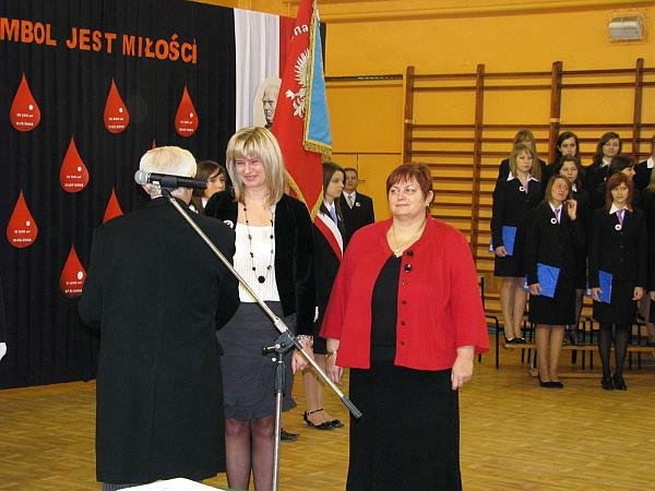 Przedstawiciel Starostwa Powiatowego – Pan Zbigniew Sobczak w imieniu Pana Starosty Andrzeja Oziębło złożył na ręce Pani Dyrektor serdeczne gratulacje w związku z odznaczeniem sztandaru szkoły srebrną odznaką Polskiego Czerwonego Krzyża. Zaznaczył wyjątkowość uhonorowania niesienia pomocy potrzebującym i wyraził przekonanie, że odznaczenie Szkoły spowoduje jeszcze większe zainteresowanie działalnością charytatywną i krzewienie dobrych postaw wśród młodzieży.
