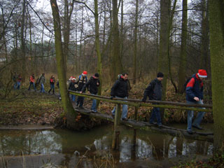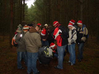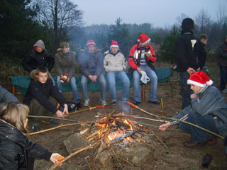 Podczas rajdu uczestnicy rozdali sobie prezenty mikołajkowe. Mimo małej mżawki było ognisko, kiełbaski i ziemniaczki pieczone. Atrakcją rajdu był kulawy pies, który przywędrował z nami z Jasionnej do Białobrzegów. Biedny, bezdomny piesek!!!!!