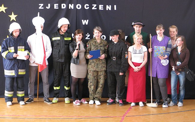 „Zjednoczeni w różnorodności” pod takim hasłem przebiegał w dniu 20 kwietnia szkolny konkurs wiedzy o Unii Europejskiej. W konkursie udział wzięło 11 drużyn reprezentujących różne klasy. Uczestnicy mieli za zadanie zaprezentować tradycję, kulturę, obyczaje wylosowanego kraju (np. taniec, piosenkę lub potrawy). Publiczność dopingowała wykonawców gromkimi brawami i świetnie się bawiła.