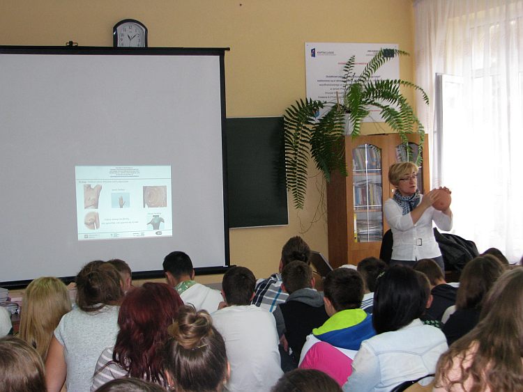 W dniu 30 października 2013r. uczniowie klas pierwszych uczestniczyli w prelekcji o charakterze zdrowotnym. Głównym tematem spotkania było zapobieganie zachorowaniu na choroby nowotworowe, a w szczególności – raka piersi i szyjki macicy. Panie prelegentki z Centrum Onkologii w Warszawie w kompetentny i rzeczowy sposób wskazały sposoby i możliwości zapobiegania tym chorobom (np. przez samobadanie piersi i udział w specjalistycznych badaniach typu usg piersi czy mammografia). Zwróciły też uwagę na to, iż palenie tytoniu, spożywanie alkoholu i brak ruchu wpływają na zachorowalność na te choroby. Prelekcję dopełnił pokaz i nauka badania piersi na fantomie.