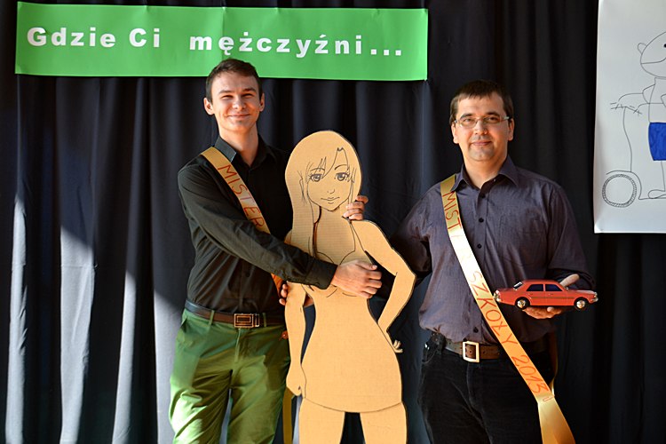 Punktem kulminacyjnym imprezy było ogłoszenie wyników wyborów na Mistera Szkoły w dwóch kategoriach: nauczyciel i uczeń. Misterem Szkoły w I kategorii został ks. Robert Kuropieska. Niestety zwycięzca był nieobecny i jego obowiązki przejął pan Krzysztof Harwacki, który zajął drugie miejsce w głosowaniu. Zwycięzca otrzymał nagrodę ufundowaną przez Panie nauczycielki i pracownice szkoły- do obejrzenia na zdjęciach! W kategorii uczeń zwyciężył Przemysław Siek z klasy II TLPS, dla którego nagrodę – podwójny bilet do kina ufundowała Rada Rodziców, natomiast koleżanki ze szkoły zapewniły osobę towarzyszącą.