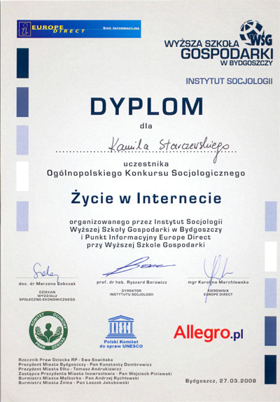 Z wielką radością odebraliśmy wiadomość we wtorek 15 kwietnia 2008r., że uczennica Ewelina Wlazło została laureatką konkursu, gdyż otrzymała wyróżnienie I stopnia. Spośród 104 prac konkursowych praca Eweliny została uznana za jedną z najlepszych w kategorii prezentacja multimedialna. Prace oceniane były przez Jury złożone ze specjalistów reprezentujących różne dziedziny nauki i sztuki. Jury konkursu przyznało jedną nagrodę główną oraz wyróżnienia I i II stopnia. Wśród trzech uczestników konkursu, którzy otrzymali wyróżnienie I stopnia znalazła się na drugim miejscu Ewelina Wlazło. Wyniki zostały ogłoszone na stronie Konkursu pod adresem: www.zyciewinternecie.wsg.byd.pl