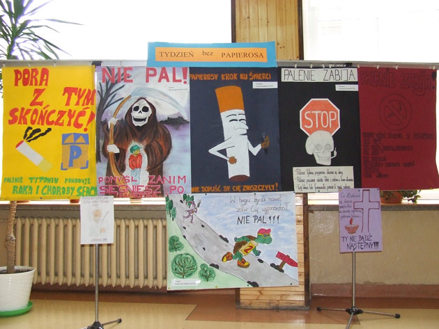 W dniach 5 – 12 listopada 2007 roku w naszej szkole obchodzony jest „Tydzień bez papierosa” w celu uświadomienia wszystkim palaczom, jak wielkimi szkodnikami są papierosy. Według WHO tytoń jest jedną z głównych przyczyn zgonów, a nikotynizm jest jedną z najpoważniejszych chorób współczesnego świata. Ideą tej akcji jest zwrócenie uwagi nie tylko na szkodliwość palenia tytoniu, ale także zaapelowanie do palaczy o podjęcie decyzji woli, mających na celu wyzwolenie się z tego straszliwego uzależnienia. Uczniowie naszej szkoły pod kierunkiem pani Jolanty Babik i Elżbiety Michalak, wzięli udział w szkolnym konkursie plastycznym na temat „Szkodliwości palenia tytoniu”.