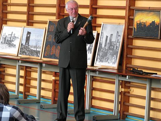 Tak mówił o swojej książce „Moja wojna 1939 -1945” pan Janusz Wałkuski, który wraz z żoną panią Anną przybyli na spotkanie do naszej szkoły w dniu 30 września. Opowieści o wojnie w stolicy, przekazywane przez uczestnika tych strasznych wydarzeń, stały się bardziej rzeczywiste i bliższe. Wspomnieniom towarzyszyły rekwizyty z tamtych czasów, które były z młodym Januszem w tych trudnych chwilach np. plecak w którym przenosił chleb z jednej na drugą stronę Wisły. Młodzież mogła ich dotknąć, dokładnie obejrzeć, a nawet niektóre założyć, aby jeszcze lepiej poczuć historię. Pan Janusz nie jest tylko pisarzem, historykiem ale także malarzem. Na swoich obrazach upamiętnił Warszawę, tę, którą zapamiętał z lat wojny. Obrazy są w kolorystyce czarno - białej, dzięki czemu oddają bardziej grozę tamtych dni. Zainteresowanie spotkaniem było wielkie. Wszystkim nam stali się bliżsi – cisi bohaterowie, walczący o honor i wolność, oddając swoje życie, abyśmy my dzisiaj mogli spokojnie żyć w wolnej i pięknej Ojczyźnie.