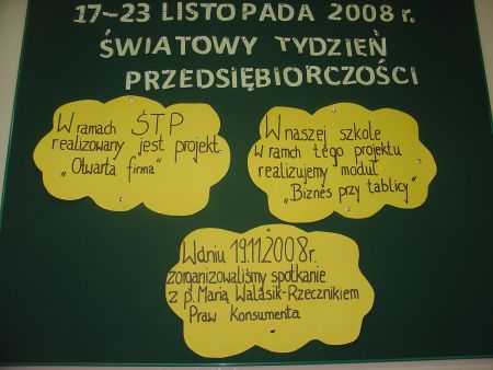 W dniach 17-23 listopada 2008r. nasza szkoła wzięła udział w organizowanym po raz pierwszy w Polsce międzynarodowym projekcie - Światowy Tydzień Przedsiębiorczości. Przewodniczącym Komitetu Honorowego Światowego Tygodnia Przedsiębiorczości w Polsce jest Pan Waldemar Pawlak, Wicepremier RP i Minister Gospodarki. Dzięki realizacji tego projektu szkoła wzbogaca swoją ofertę edukacyjną o ciekawe zajęcia przygotowujące uczniów do wejścia na rynek pracy, stwarza okazję do uczestniczenia w ogólnoświatowych działaniach wspierających i promujących przedsiębiorcze postawy.