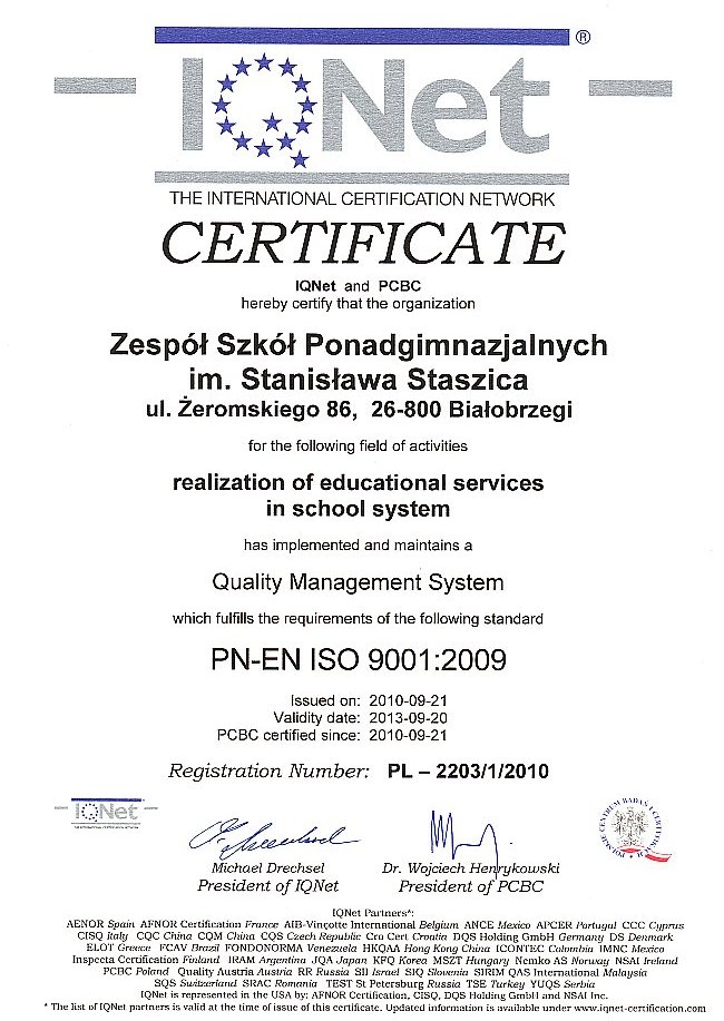 Jesteśmy pierwszą w powiecie białobrzeskim i powiatach ościennych placówką oświatową, której działalność jest zgodna z wymaganiami normy międzynarodowej, co potwierdza nasze stałe dążenie do doskonalenia pracy szkoły i zapewnienia jak najlepszych warunków nauki i pracy wszystkim członkom naszej społeczności szkolnej.