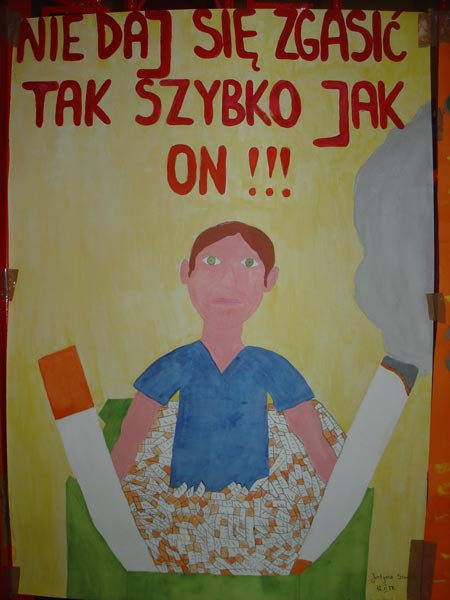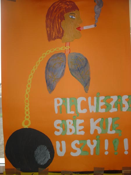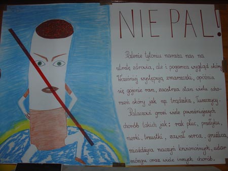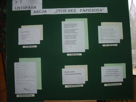 W holu głównym szkoły zorganizowana została wystawa prac konkursowych – wierszy i plakatów oraz udostępniono ulotki edukacyjne o szkodliwości palenia tytoniu, z którymi można się zapoznać celem uświadomienia sobie szkodliwego wpływu papierosów na organizm człowieka.